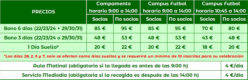 CAMPUS DE FÚTBOL para edades desde los 5 a los 16 años y se desarrolla en las pistas de césped y de fútbol sala incluyendo entrenamientos de tecnificación así como competiciones y partidos. A elegir entre horario completo de 9:00 a 14:00 o reducido de 10:45 a 14:00 h. Opción de aula matinal desde las 8:00 y mediodía hasta las 15:00 h.