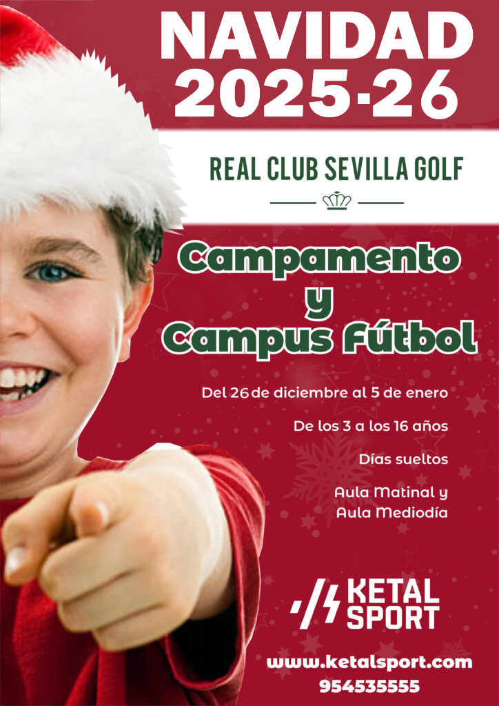 Bienvenid@ al Campamento de Navidad y al Campus de Fútbol del Real Club Sevilla Golf para niñ@s desde los 3 a los 16 años que sean socios o familiares/amigos de socios. El campamento será en horario de mañana y se celebrará en los 10 días laborables comprendidos entre el lunes 22 de diciembre y el miércoles 7 de enero. La inscripción se podrá realizar por bonos de 3 o 6 días y/o por días sueltos (ver abajo calendario y precios).
